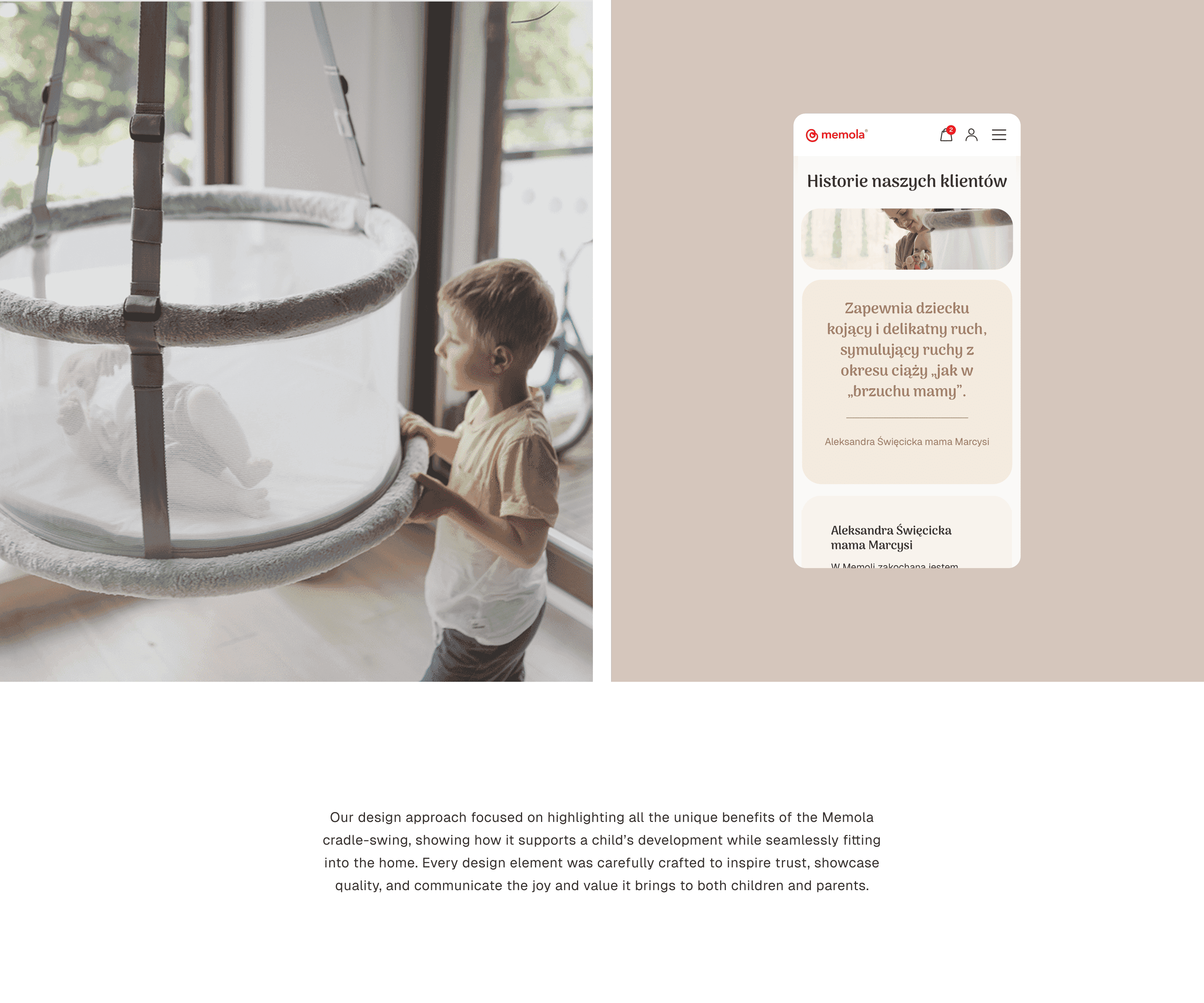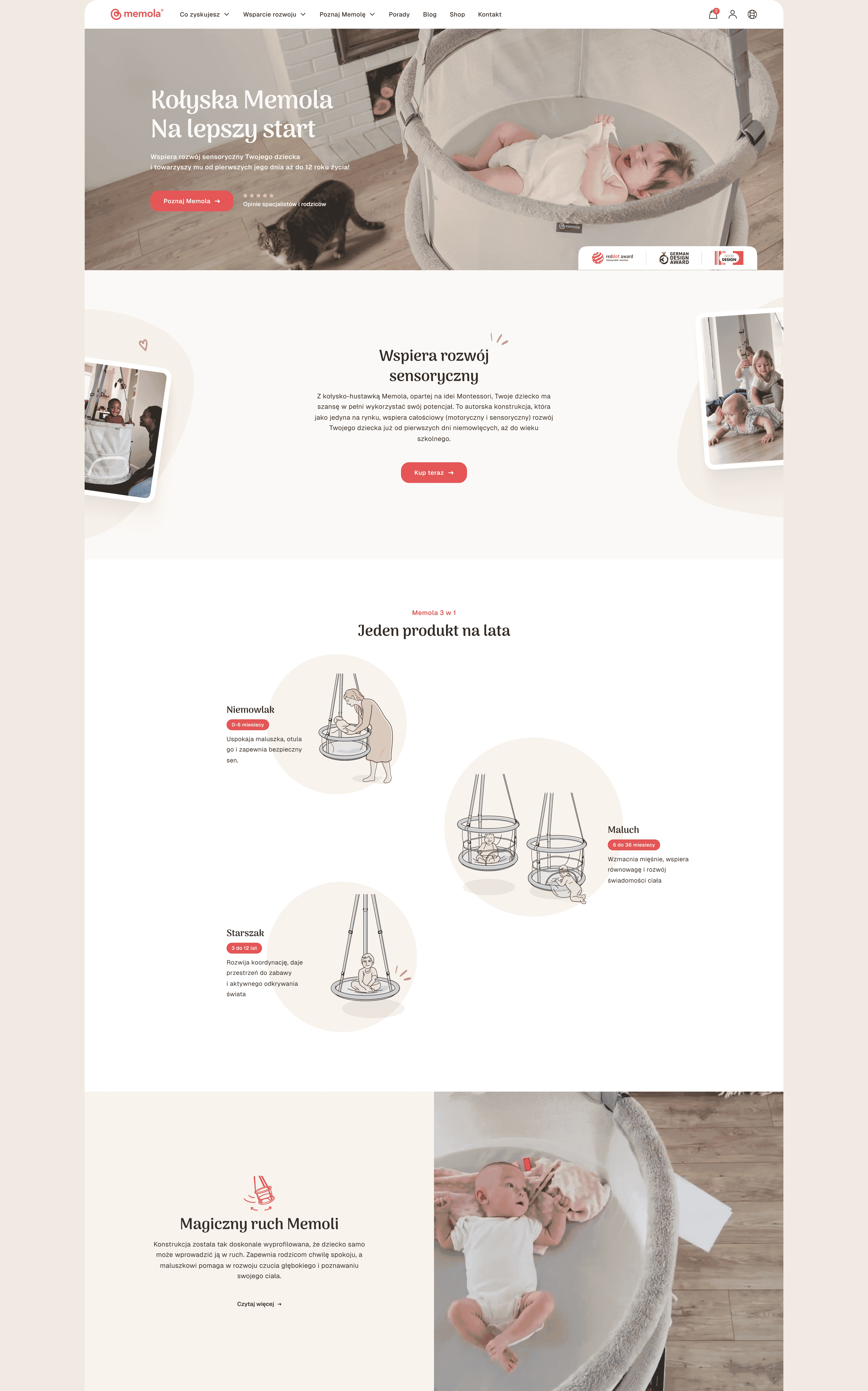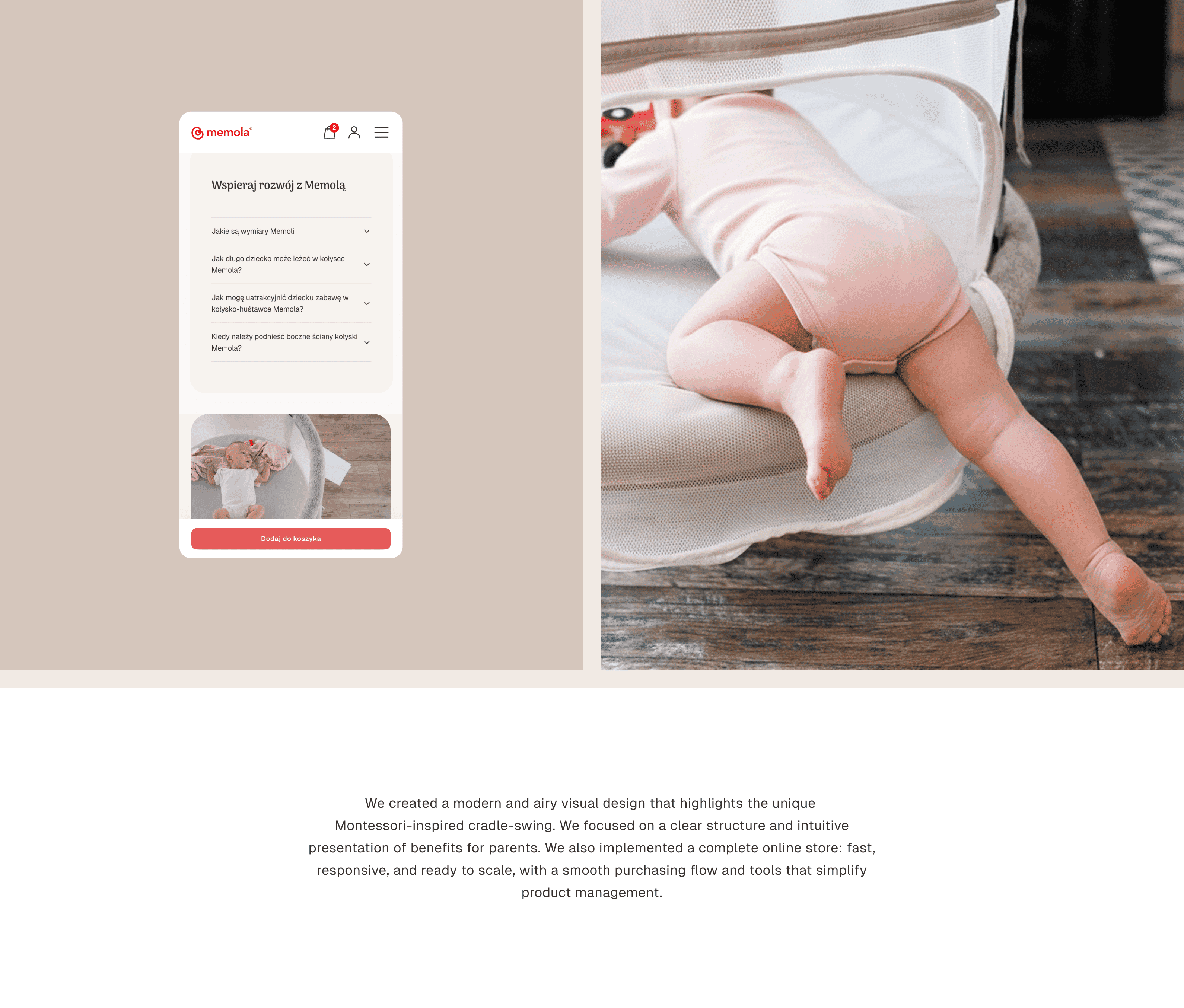 We created a modern and airy visual design that highlights the unique Montessori-inspired cradle-swing. We focused on a clear structure and intuitive presentation of benefits for parents. We also implemented a complete online store: fast, responsive, and ready to scale, with a smooth purchasing flow and tools that simplify product management.